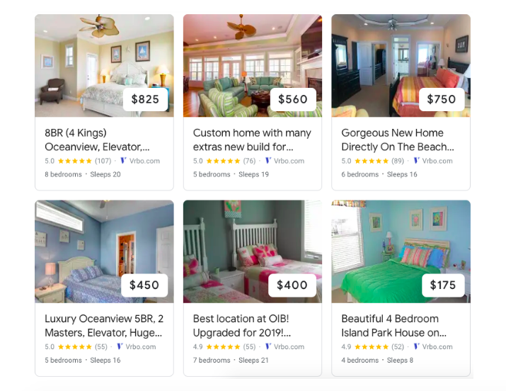 The reason this is such a concern for local vacation rental agencies is the fact that Google has partnered with the OTAs on this and are only pulling properties from their sites. Let’s take the term “Ocean Isle Beach vacation rentals” for example (since OIB is where our office is located). If you check out Google’s Vacation Rental Search for that term, you’ll find a search results page that looks like it came straight from VRBO’s website. That is, until you scroll through the properties and start to find a few others mixed in from RedAwning, Hotels.com, etc: