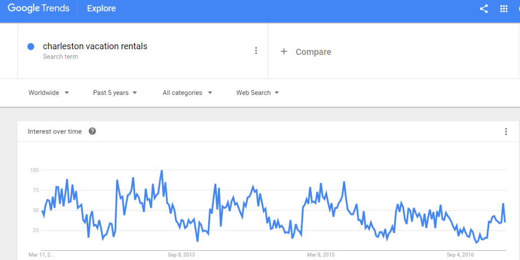For an example take a look at these screenshot. You can see the search term “Charleston vacation rentals” and see the interest over a period of time for that specific search term.