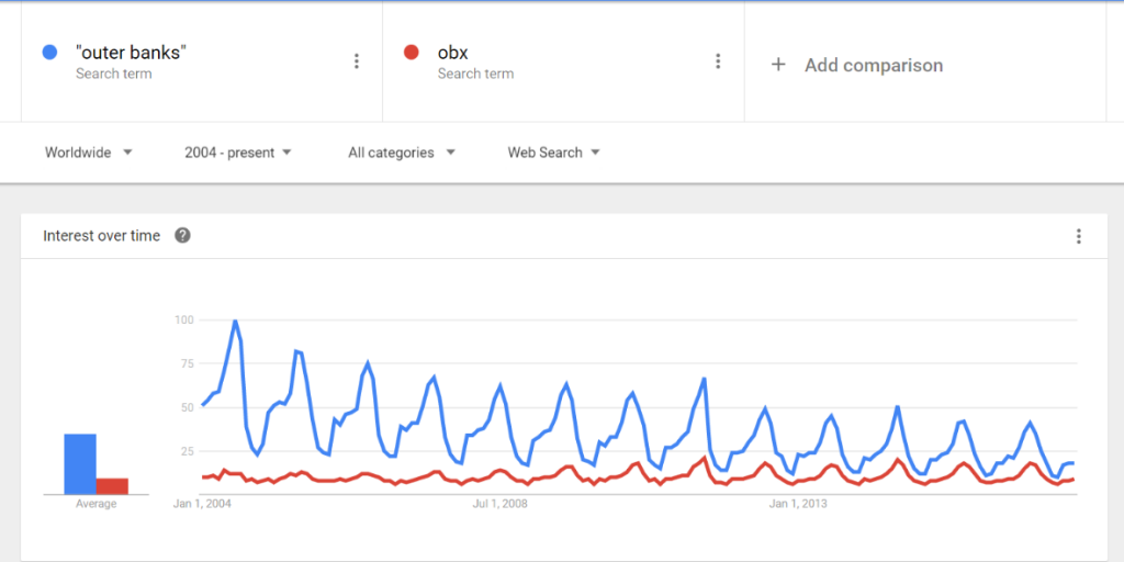 This example shows you the interest over time of the keywords, Outer Banks and OBX. As you can see year over year, there has been less searches performed for Outer Banks. However, you can see people are starting to use the term OBX instead of the full name.